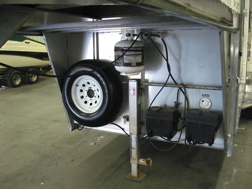 Kingpin hitch with 2 5/16" coupler, breakaway switch with battery, and safety chains with slip hooks.