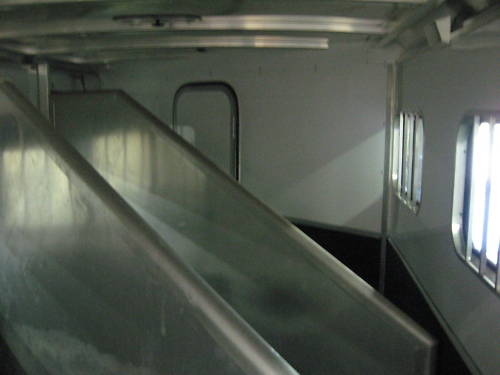 Side unload door with cam latch and 15" x 24" window with bars and screen in front of first horse.