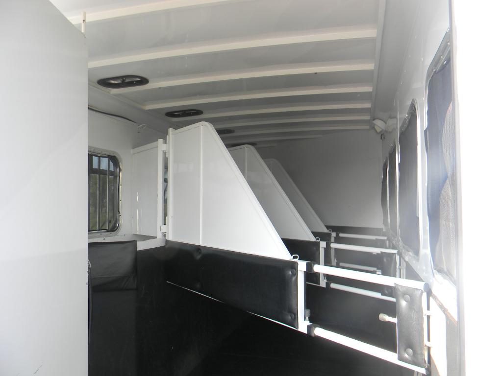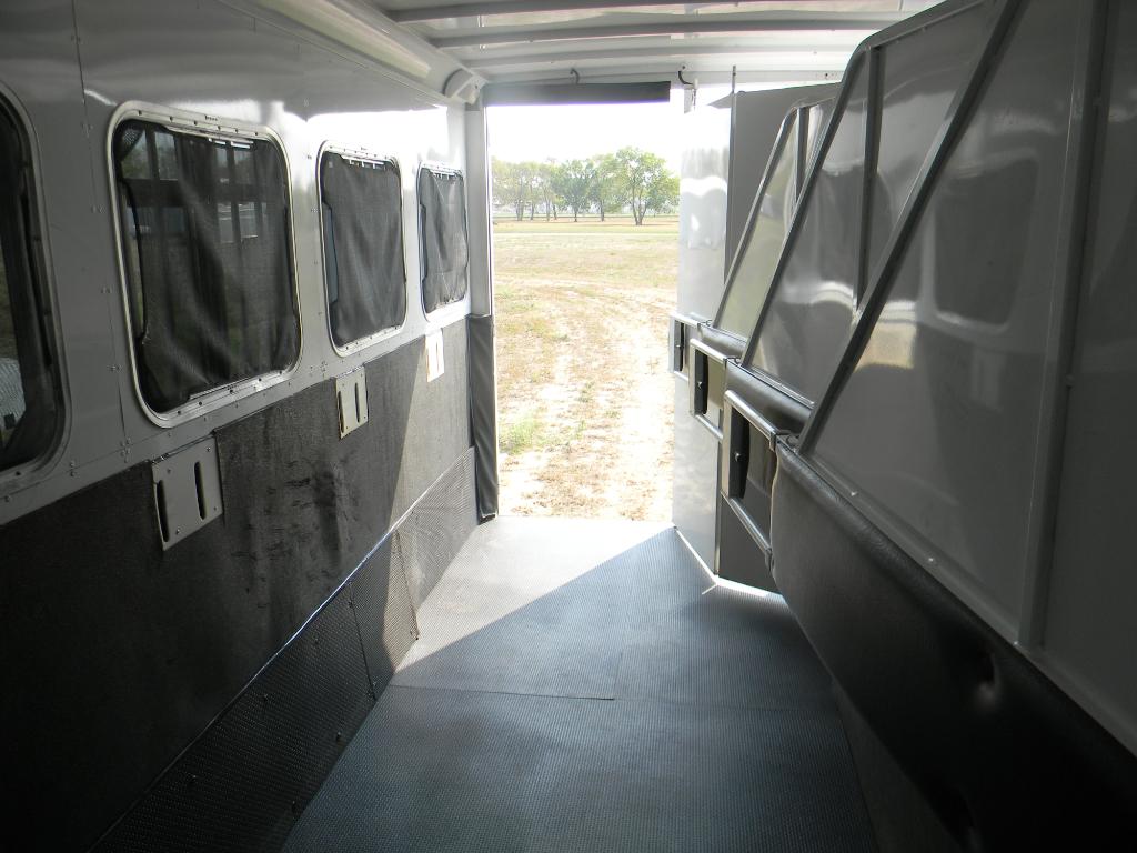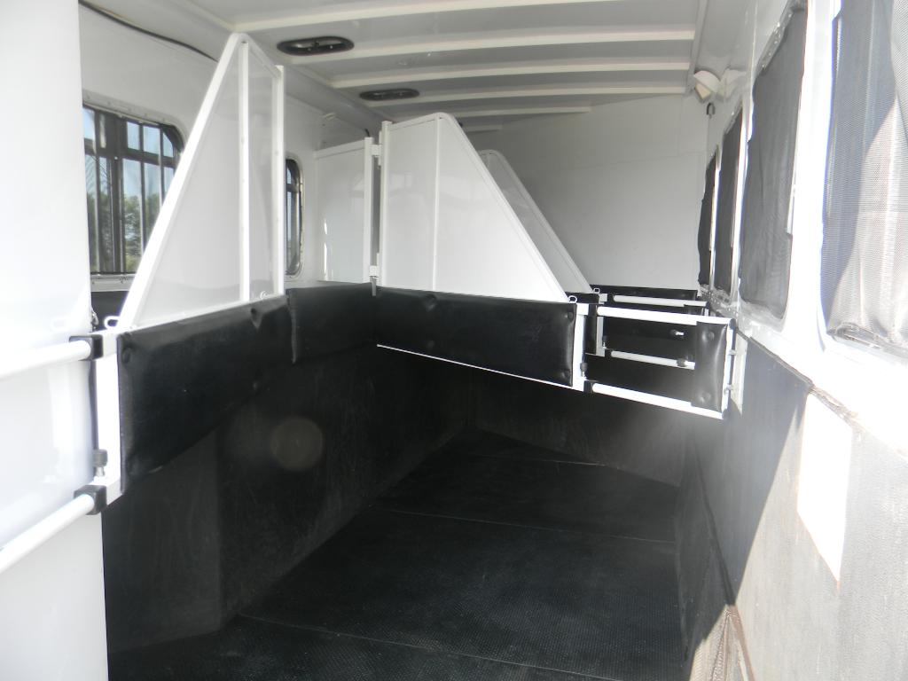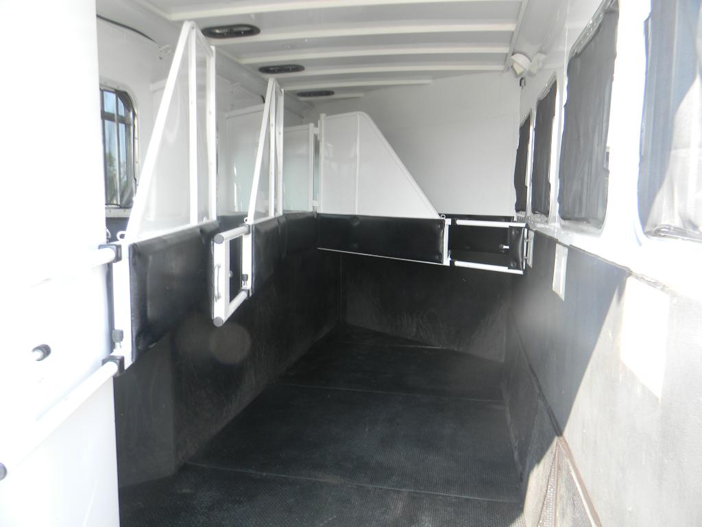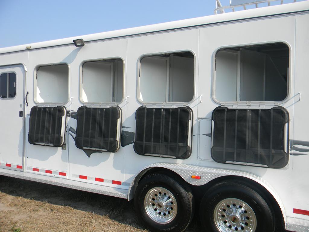 This trailer has 4 drop down window hatches on each side of the horse stalls!! The drop down windows also have slider windows w/ screens if you prefer to leave them up. If you choose to drop the windows down the open area has bars across and also another darker screen to shield your horse from the sun & keep bugs out!!