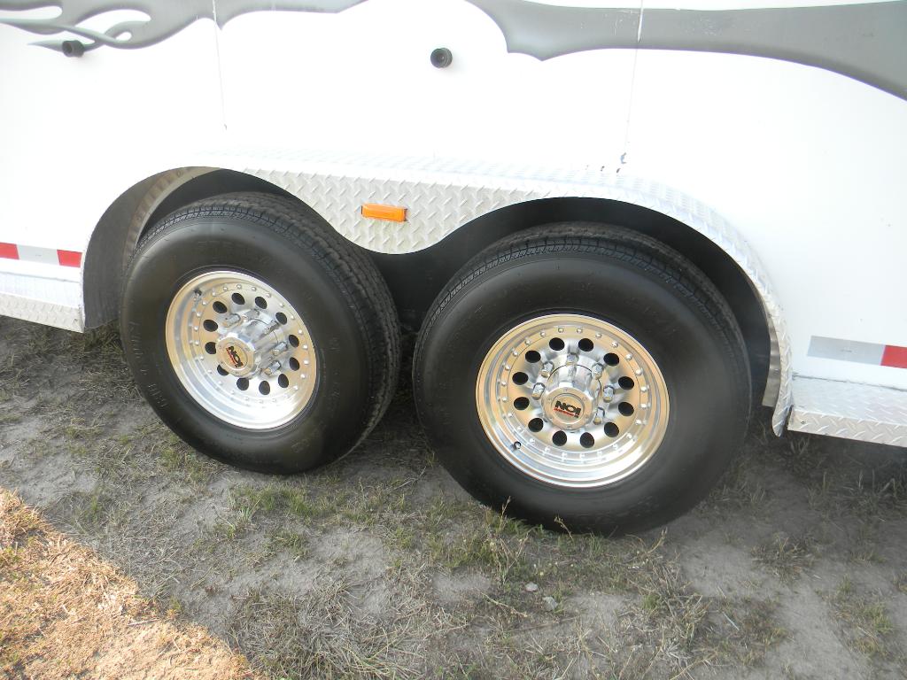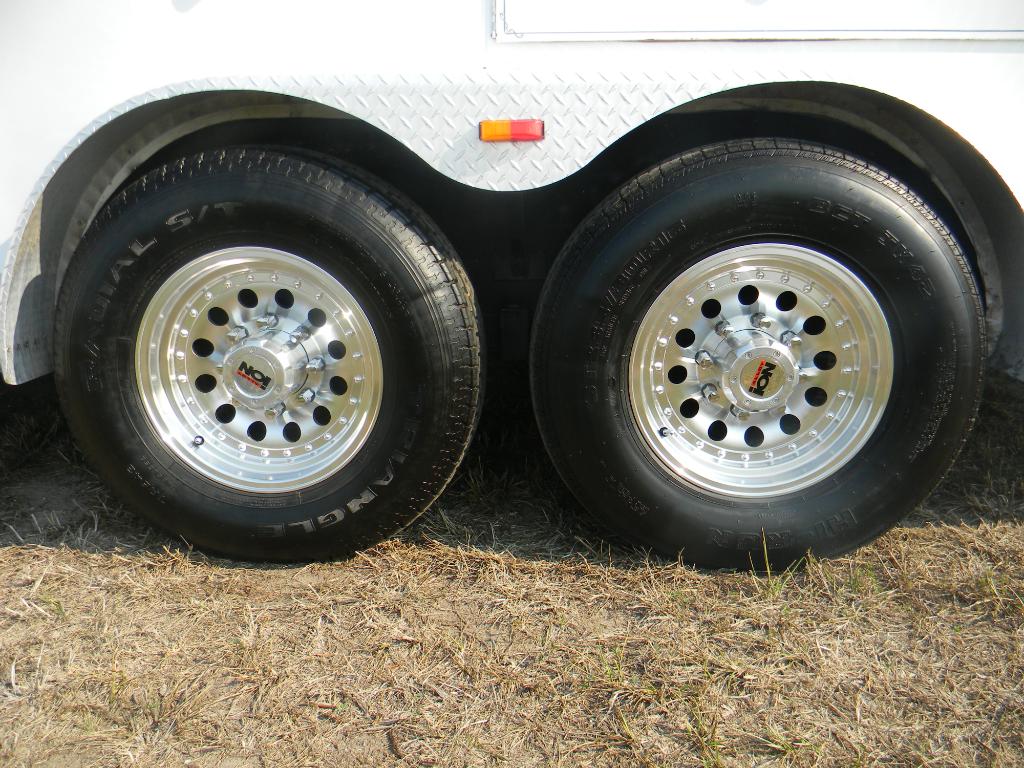 This gooseneck trailer has custom alloy wheels with good tires (spare included)