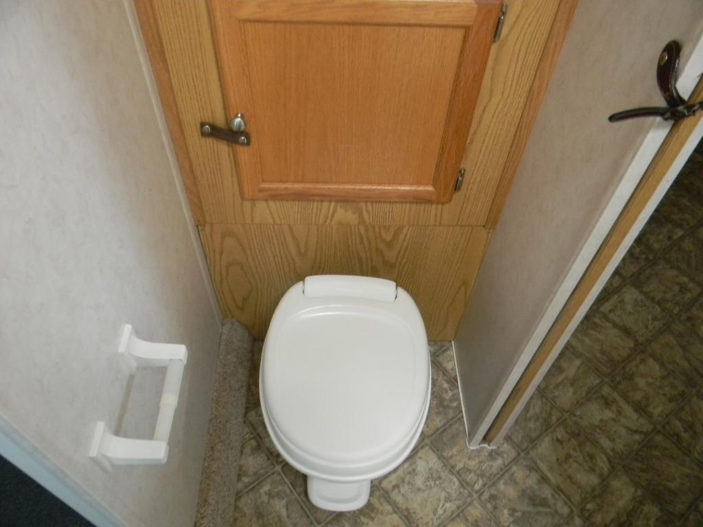 Toilet area with storage above